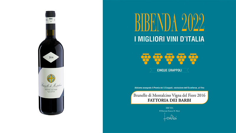 Bibenda 2022, la Guida dei Vini della FIS | Fondazione Italiana Sommelier, ha assegnato il massimo punteggio dei 5 grappoli al Brunello di Montalcino Vigna del Fiore 2016 di Fattoria dei Barbi.