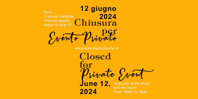 Dear Customer, Fattoria dei Barbi (wine tastings, dairy shop of Caseificio dei Barbi, guided tours), Taverna dei Barbi and Museo del Brunello will stay CLOSED on Wednesday June 12, 2024, for a private event.  Just wine shop will be OPEN from 10am to 5pm. All services will be available again since Thursday June 13, starting at…