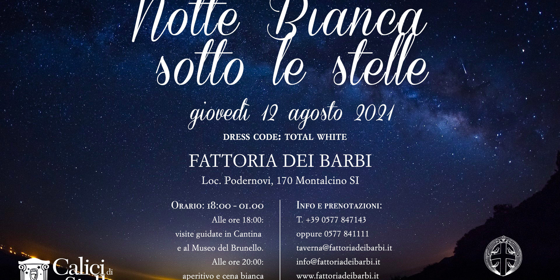 Vino, visite itineranti e una cena in total white a lume di candela sotto il firmamento. Torna giovedì 12 agosto la Notte Bianca alla Fattoria dei Barbi, l’evento serale – e su prenotazione – dedicato agli amanti del vino e degli astri, organizzato in occasione dell’iniziativa nazionale Calici di Stelle del Movimento turismo del vino.